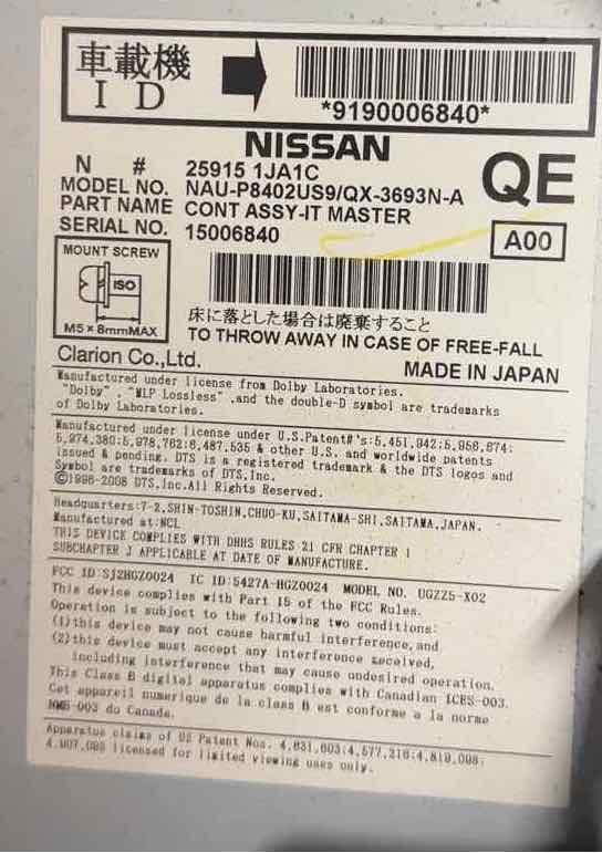 INFINITI INFINITI G25 11 Receiver (AM-FM-stereo-CD), W/navigation Part:638 Radio Audio Receiver, Navigation System, (AM-FM-stereo Single